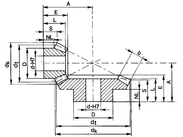 ![]() Art.Nr.: 355577 Artikel: 9 von 20 | Kegelrad aus AzetalharzModul 1,0 / 45 Zähne / Bohrung 10,0 mm/ passend zu Artikel Nr.355576/ Untersetzung 1:3Modul 1,0 / Zähnezahl 45, Kopfkreis (dk) 46,1 mm Ø, Teilkreis (dt) 45 mm Ø, Bund Ø (D) 23,4 mm Ø, Bundhöhe (NL) 9,6 mm, Bohrungtiefe (L) 16,5 mm, ges. Höhe (E) 18,2 mm, verzahnte Breite (b) 9,2 mm, Bohrund Ø (d) 10 mm, Abstand Achsmitte (A) 22,7 mm, passend zu Artikel Nr.355576, Untersetzung 1:3, Winkel 90 Grad, (Preisangabe für 1 Stück)- | |
