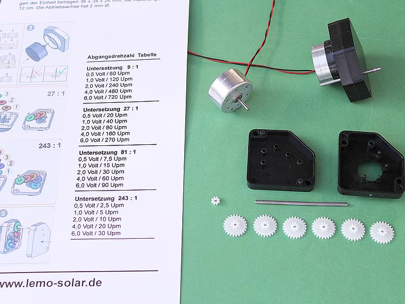 ![]() Art.Nr.: GM243 Artikel: 82 von 113 | Universal Getriebemotor als BausatzGetriebemotor 0,3 - 6 V / 9:1-243:1Dieses Universalgetriebe mit integriertem Solarmotor RF300 zeichnet sich durch eine Vielzahl unterschiedlicher Drehzahlen aus, die bei der Montage frei bestimmt werden können. Je nach Anzahl der eingesetzten Zahnräder (bis 6 Stück) kann die Drehzahl den eigenen Bedürfnissen angepasst werden. Folgende Untersetzungen sind einstellbar: 9:1 / 27:1 / 81:1 / 243:1. Von ganz langsamen 2.5 Upm bis hin zu 720 Upm, mit diesem Getriebe sind wirklich alle Drehzahlen möglich! Dank des großen Spannungsbereichs des mitgelieferten Motors (0,3 - 6,0 V), kann die Einheit per Batterie, Solarzelle oder einem Netzteil betrieben werden. Stromaufnahme 15 - 120 mA. Die Befestigungsbohrungen liegen im 30 mm Raster zueinander und können bei Bedarf mit M3 Schrauben und Muttern befestigt werden. Die Abmessungen der Einheit betragen 36 x 38 x 26 mm, die Kabellänge 12 cm. Die Abtriebsachse hat 2 mm Ø. | |