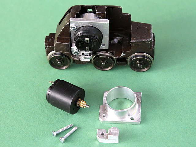 ![]() Art.Nr.: UMDG1717 Artikel: 10 von 20 | Umbausatz für MÄRKLIN Modelleisenbahn DrehgestelleUmbau der Motorisierung für MÄRKLIN Modelleisenbahn Drehgestell.Umbau der Motorisierung für MÄRKLIN Modelleisenbahn Drehgestell. Geeignet für elektrische Lokomotiven 3357, 3358, 3558, 3658 und andere, natürlich auch für Eigenumbauten. Anmeldung beim Patentamt Nr. 20 2012 000 889.7. Leichter Umbau der professionellen Motorisierung mit Glockenanker-Motor 1717T012SR. Umbau: Originalmotor ausbauen, Drehgestell-Mitnehmerzapfen am Drehgestell entfernen, Glockenankermotor mit Motoraufnahme anschrauben, neuen Drehgestell-Mitnehmer anschrauben. Es werden die Original Gewindelöcher von Drehgestell verwendet. Eine ausführliche Umbauanleitung liegt dem Umbausatz bei. Umbausatz-Material: Faulhaber Glockenankermotor 1717T012SR mit Ritzel M 0,4 / 8 Z. Nennspannung 12 Volt, Betriebsspannung 0,2 - 19 Volt, Leerlaufdrehzahl 14 000 Upm, Leistung 2 Watt, Anhalte-Drehmoment 5,38 mNm, Leerlaufstrom 23 mA, empf. Dauerstromaufnahme 300 mA, Wirkungsgrad 70 %, Gewicht 18 Gramm. Motoraufnahme (Material Alu) 25 x 23 x 11 mm, Drehgestell-Mitnehmer 13 x 7 x 8 mm, 2 Schrauben M 2 . | |
