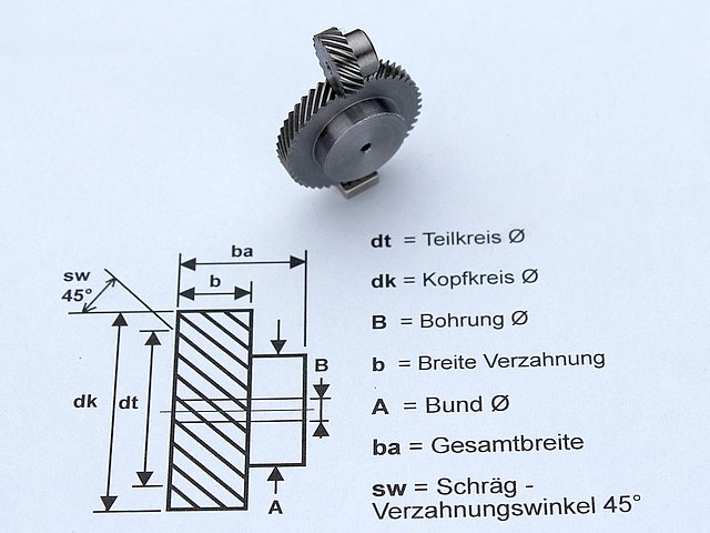 ![]() Art.Nr.: SR0519 Artikel: 2 von 21 | Schraubenrad Stahl mit BundSchraubenzahnrad Modul 0,5 / 19 Zähne / Bohrung 2,0Schraubenzahnrad Modul 0,5 / 19 Zähne / Bohrung 2,0 mm, Kopfkreis 11,5 mm Ø, Teilkreis 10,5 mm Ø, Bund 8 mm Ø, Gesamtbreite 8 mm, Breite der Verzahnung 4 mm, Sonderposten lieferbar solange Vorrat ! Bei Schraubenrädern verlaufen die Zähne schraubenförmig auf dem zylindrischen Radkörper. Der Schrägverzahnung Winkel beträgt 45°, dadurch sind die Achsen beider Räder um 90° versetzt. | |