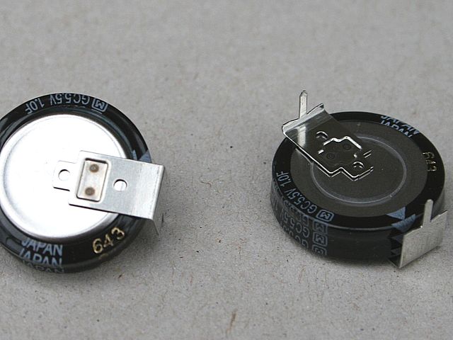 ![]() Art.Nr.: GC551 Artikel: 11 von 69 | GoldkondensatorGOLDCAP Kapazität 1 F / 5,5 VMax. Ladespannung 6 Volt, Kapazität 1F = 1 000 000 µF, Maße 19 mm ø x 5 mm lang, Anschlüsse 1,0 ø x 4 mm, Gewicht 4 Gramm, Anwendungsbeispiel: bei Solarmobilen Goldkondensatoren wirken ähnlich wie Akkus als Energiespeicher. Sie bringen jedoch eine wesentlich höhere Leistung, da sie extrem schnell be - und entladen werden können. Ein Goldkondensator ist ein Doppelschichtkondensator, der bei kleinen Abmessungen und hoher Zuverlässigkeit die Eigenschaft einer Batterie und eines Kondensators miteinander verbindet. Weitere wichtige Vorteile: Der Goldkondensator benötigt keine Ladeüberwachung. Da der Goldkondensator nicht überladen werden kann und eine Tiefentladung ungefährlich ist, ist keine Ladeüberwachungselektronik erforderlich. Der Goldkondensator begrenzt den Ladestrom automatisch durch seinen internen Widerstand. Der Ladestrom muß deshalb nicht extern begrenzt werden. Kurze Ladedauer: Der Goldkondensator kann schnell geladen werden, wobei keine chemische Reaktionen ablaufen. Er kann deshalb innerhalb kurzer Zeit vielmals ge- und entladen werden. Umweltfreundlich: Für den Goldkondensator werden keine toxischen Materialien wie Cadmium und Quecksilber verwendet. Die Elektroden im inneren des Goldkondensators bestehen aus Aktivkohlefaser. Problemlose Reihen - oder Parallelschaltung, 6 Volt als max. Ladespannung pro Goldkondensator dürfen nicht überschritten werden. | |