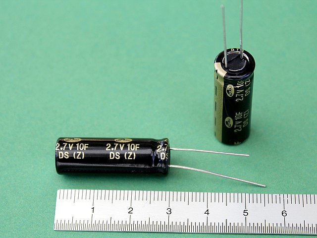 ![]() Art.Nr.: HC2710 Artikel: 10 von 69 | Hochkapazitäts-Kondensator 10 F / 2,7 VoltKompakte Kondensatoren Power als Batterie-ErsatzKompakte Kondensatoren Power als Batterie-Ersatz. Hochkapazitäts-Kondensator 10 F / 2,7 Volt. Superkondensatoren, auch als Ultra oder elektronische (EDLC) Doppelschichtkondensatoren bezeichnet, liefern mehr Leistungsdichte als Batterien und leben deutlich länger. Kapazität 10 F = 10 000 000 µF = (10 Amp./Sekunde), Nennspannung 2,7 Volt, max. Ladespannung 3,5 Volt, max. Ladestrom (1 Sek.) 8,3 Amp., Innenwiderstand 50 m, Maße: 10 mm Ø x 30 mm, Lötanschlüsse 0,5 mm Ø, Rastermaß 4,5 mm, Gewicht 2,9 Gramm. Der Goldkondensator benötigt keine Ladeüberwachung. Da der Goldkondensator nicht überladen werden kann und eine Tiefentladung ungefährlich ist, ist keine Ladeüberwachungselektronik erforderlich. Der Goldkondensator begrenzt den Ladestrom automatisch durch seinen internen Widerstand. Er kann deshalb innerhalb kurzer Zeit vielmals ge- und entladen werden. Umweltfreundlich: Für den Goldkondensator werden keine toxischen Materialien wie Cadmium und Quecksilber verwendet. Problemlose Reihen - oder Parallelschaltung, 3,5 Volt als max. Ladespannung pro Goldkondensator dürfen nicht überschritten werden. HINWEIS: Glockenanker-Solarmotoren laufen mit einem geladenen Goldcap 10 F mehrere Stunden. | |