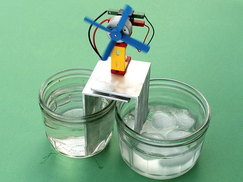 ![]() Art.Nr.: TE4040 Artikel: 27 von 69 | Peltierelement thermoelektrischer EnergiewandlerBausatz PeltierelementPeltierelement thermoelektrischer Energiewandler. Peltierelement montiert zwischen zwei Aluwinkeln. Die Aluwinkeln sind in zwei Gläser eingetaucht. Rechtes Glas ist gefüllt mit Eiswürfeln und kaltem Wasser und linkes Glas mit heißem Wasser. Nach kurzer Zeit beginnt sich die Luftschraube auf der Solarmotorwelle zu drehen. Es kann auch mit einem Digitalvoltmeter die Spannung und der Strom gemessen werden. Ein Peltierelement ist ein thermoelektrischer Energiewandler, der einen Wärmestrom in Elektrizität (Seebeck-Effekt) oder einen Stromfluss in Wärme (Peltiereffekt) umwandelt. In einem Stromkreis aus zwei unterschiedlichen Matalldrähten entsteht eine elektrische Spannung, wenn zwischen den Enden einer Stange jeweils ein Temperaturunterschied herrscht. Diese Effekte endeckte der deutsche Physiker Thomas Johan Seebecker (1770 -1831) zufällig und nutzte diesen Effekt 1821 in einem ersten Thermoelement. Diesem Effekt entscheiden Vorgänge im Leitungsband von Metallen. Dies sind im Metallgefüge freie bewegliche Elektronen, welche je nach Metall ein unterschiedliches Energieniveau aufweisen. Lieferung erfolgt ohne abgebildete Wassergläser ! | |