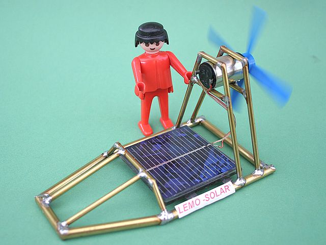 ![]() Art.Nr.: SOLK6020 Artikel: 1 von 45 | Solar Krabbler BausatzSolar Krabbler, Läufer, Hüpfe.Solar Krabbler, Läufer, Hüpfer. Die zwei in Serie verschaltenen Solarzellen bringen den Solarmotor auf ca. 1200 Upm (Umdrehungen pro Minute). Durch die Schwungmasse auf der Motorwelle wird eine Unwucht, erzeugt und auf das ganze Modell übertragen. Das Modell bewegt sich lustig auf seinen vier Beinen. Ein Solarmodell für Schulen, Bastler, Tüftler und zum verschenken. Bausatz Material : 2 Solarzellen je 52 x 26 mm / Leerlaufspannung 0,61 Volt / Nennspannung 0,5 Volt / Kurzschlussstrom 483 mA / Nennstrom 454 mA / Leistung 227 mW / Art.Nr.SZZ5226, 1 Solarzellenmontageplatte, 1 Solarzellen Klebeband, Solarzellen Lötverbinder, 1 Solarmotor Art.Nr.6020, 1 Unwucht, Lötzinn, 4 Silberdrähte 1,5 mm Ø, x 70 mm, 1 Fischertechnik Baustein 5 (abgeändert), 1 Fischertechnik Baustein 15 (abgeändert), Bauanleitung. | |