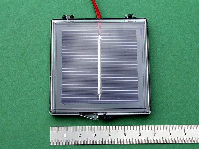 ![]() Art.Nr.: SM3360 Artikel: 10 von 34 | Eingerahmtes Solarmodul 3 V / 362 mASolarmodul (Fertigmodul) 3 V / 362 mA / 850 mWFertiges Solarmodul mit 5 Solarzellen 52 x 19 mm Monokristallin. Eingerahmt zwischen (PLEXIGLAS), Leerlaufspannung 3,05 Volt, Nennspannung 2,5 Volt, Kurzschlussstrom 362 mA, Nennstrom 340 mA, max. Leistung 850 mWatt, Gehäuse 135 x 70 x 9 mm, Gewicht 72 g. Einsatzgebiete: Modellbau, Schulen, Modellbau, Energieversorgung von Solarmodellen, Freizeit, Baukästen, usw. Standardmessbedingungen bei Solarzellen: Lichtspektrum AM 1,5, Bestrahlungsstärke E = 1000 Watt / m², Zellentemperatur 25 C°. | |
