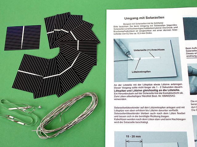 ![]() Art.Nr.: SES523926 Artikel: 58 von 58 | Solarzellen-Einsteiger-SetFaszination Solarzelle, Einsteiger-SetAnleitung für das Löten von Solarzellen Faszination Solarzelle. Solarzellen Einsteiger-Set für Schulen und alle die noch nie Solarzellen gelötet haben. Material: 4 Solarzellen 52x39, Art.Nr.SZZ5239, Leerlaufspannung 0,61 Volt, Nennspannung 0,5 Volt, Kurzschlussstrom 725 mA, Nennstrom 681 mA, max. Leistung 341 mWatt, Gewicht 0,96 Gramm, 2 Solarzellen 52x26, Art.Nr.SZZ5226, Leerlaufspannung 0,61 Volt, Nennspannung 0,5 Volt, Kurzschlussstrom 483 mA, Nennstrom 454 mA, max. Leistung 227 mWatt, Gewicht 0,64 Gramm, 4 x Bruchsolarzellen, Lötverbinder Art.Nr.SL05, Lötzinn, Kabellitze KLZ014, Anleitung. | |