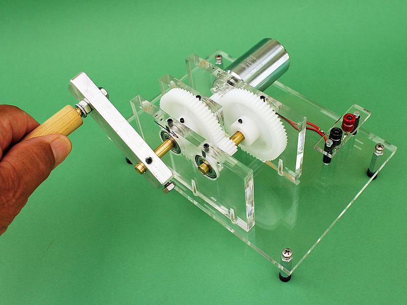 ![]() Art.Nr.: LG2310N Artikel: 7 von 20 | Kurbelgenerator zur EnergieerzeugungEnergieerzeugung für Goldkondensatoren, LEDs, Kleinradios, Motoren, für VersucheKurbelgenerator zur Energieerzeugung und zum Laden von Goldkondensatoren, Betrieb von LEDs, Kleinradios, Motoren, Getriebemotoren, für Versuche usw. Maximal erzeugte Spannung 6 Volt (bei ca. 130 Upm an der Kurbel), Kurzschlussstrom 850 mA. Bei einem 10F Goldcap beträgt die Ladedauer ca. 30 - 60 Sek., der Ladezustand kann während der Ladung durch Digitalvoltmeter überwacht werden (bei ca. 2,8 Volt ist der Goldcap voll). Maße: (L x B x H) 100 x 85 x 75 mm, Gewicht 280 Gramm. Der Kurbelgenerator kann am Vierkant Alurohr mit einer Schraubzwinge am Tisch befestigt werden. | |