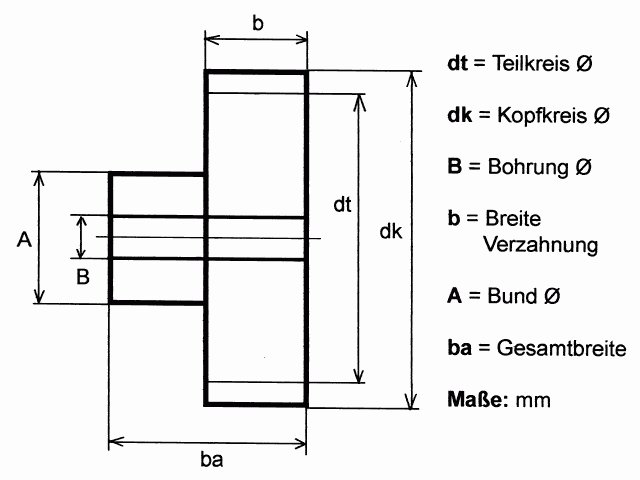 ![]() Art.Nr.: SRS0444 Artikel: 20 von 53 | Stirnzahnrad Stahl mit BundModul 0,4 / 44 Zähne / Bohrung 2,0 mmStirnzahnrad Stahl mit Bund Modul 0,4 / 44 Zähne / Bohrung 2,0 mm, Kopfkreis 18,4 mm Ø, Teilkreis 17,6 mm Ø, Bund 14,5 mm Ø, Gesamtbreite 8 mm, Breite der Verzahnung 4 mm, Sonderposten lieferbar solange Vorrat ! | |